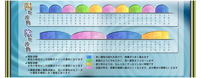 生年波動は「陽波動」と「陰波動」に分かれ、男性は陽波動、女性は陰波動の影響を強く受けます。また、互いの波動が補助し合う働きがあります。